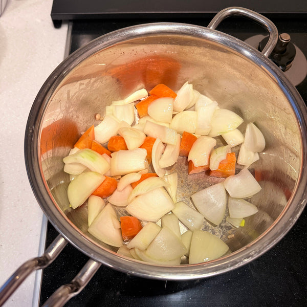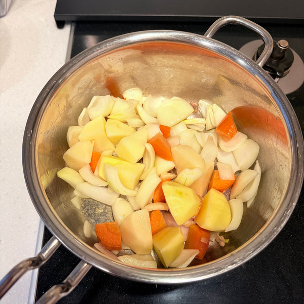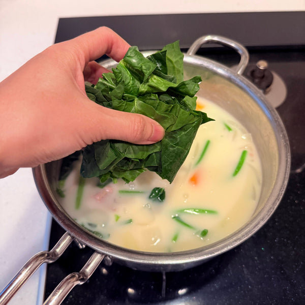 Vegetables (Onion, Carrot, Potato, Spinach) - Onion adds sweetness and umami, while carrot brings vivid color. Potatoes become silky and add a rustic touch, and spinach gives melty leaves with crunchy stems.