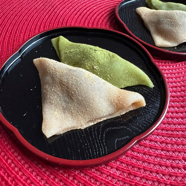 Both joshinko and shiratamako (types of rice flour) are used in making nama yatsuhashi to achieve the perfect balance of texture and consistency in this traditional Kyoto sweet. Each rice flour contributes unique characteristics that enhance the quality of the dough.