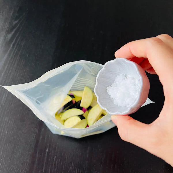 Asazuke pickles are lightly pickled in seasoning (like salt, sugar, and so on) or a seasoning liquid (seasoning+water, vinegar, soy sauce, etc.). In this recipe, we will just use salt as a seasoning and salt water as the seasoning liquid. You can choose whether you just want to use salt or salt water depending on the vegetable.